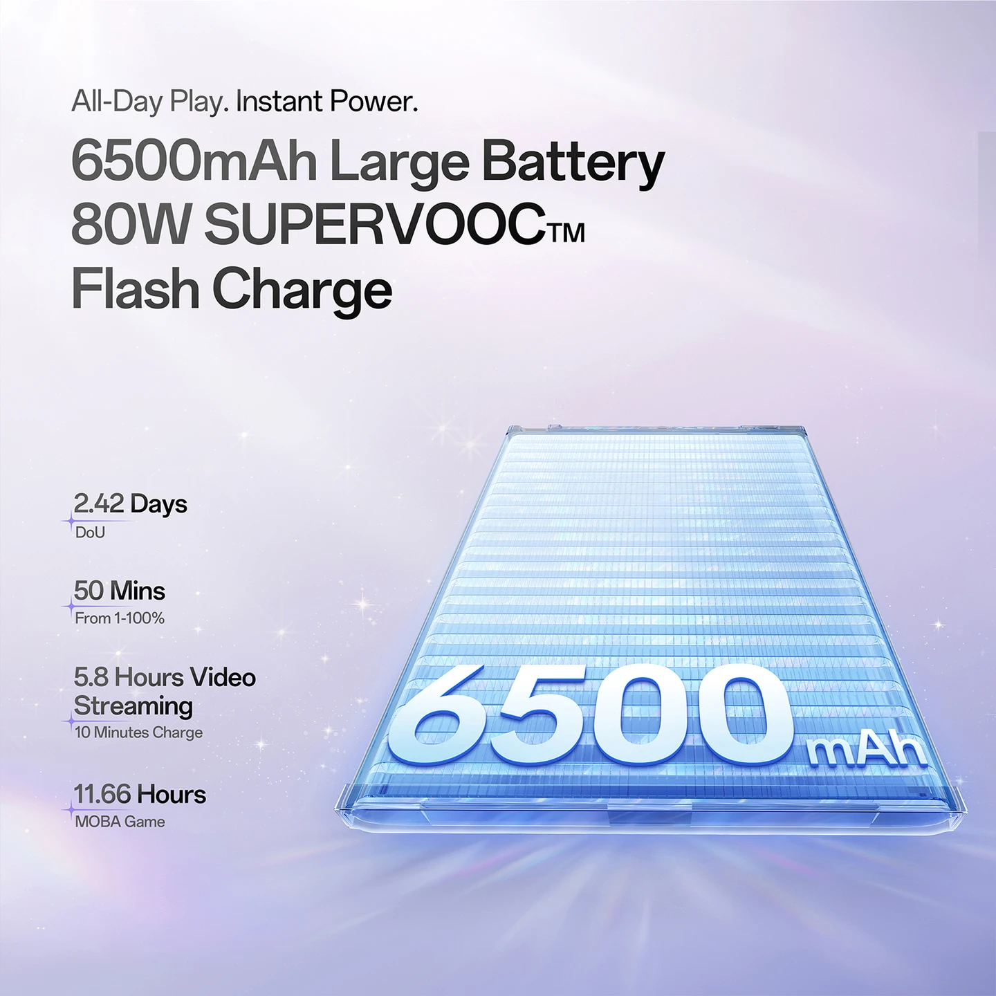 Massive Battery: A large 6500mAh battery paired with 80W SUPERVOOC fast charging ensures you spend less time at the wall outlet.